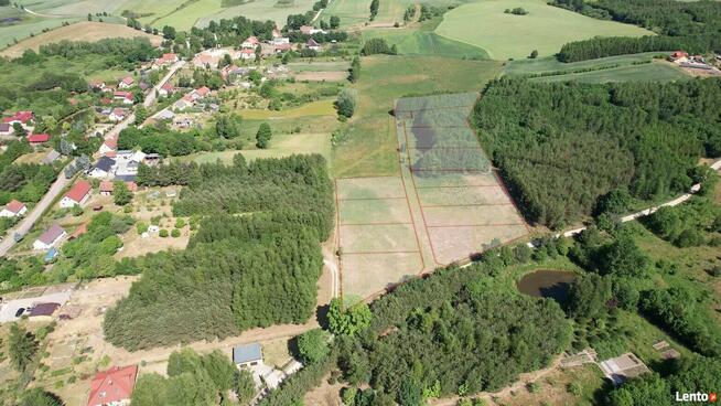 Teren pod lasem o pow. około 10 ha podzielony na działki. Do jeziora Łęsk ok. 1 km.
